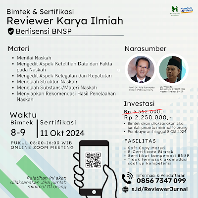 HDI Training Center akan mengadakan Bimtek dan Sertifikasi Reviewer Karya Ilmiah berlisensi BNSP, bimtek dilaksanakan pada tanggal 8-9 Oktober 2024 dan sertifikasi pada tanggal 11 Oktober 2024. Bimtek dan Sertifikasi dilaksanakn secara online. untuk leaflet dapat dilihat sebagai berikut :